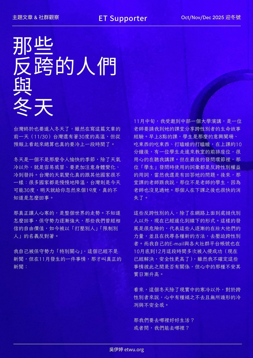 看來,這個冬天除了現實中的寒冷以外,對於跨性別者來說,心中有種褪之不去且無所遁形的冷冽與不安全感。