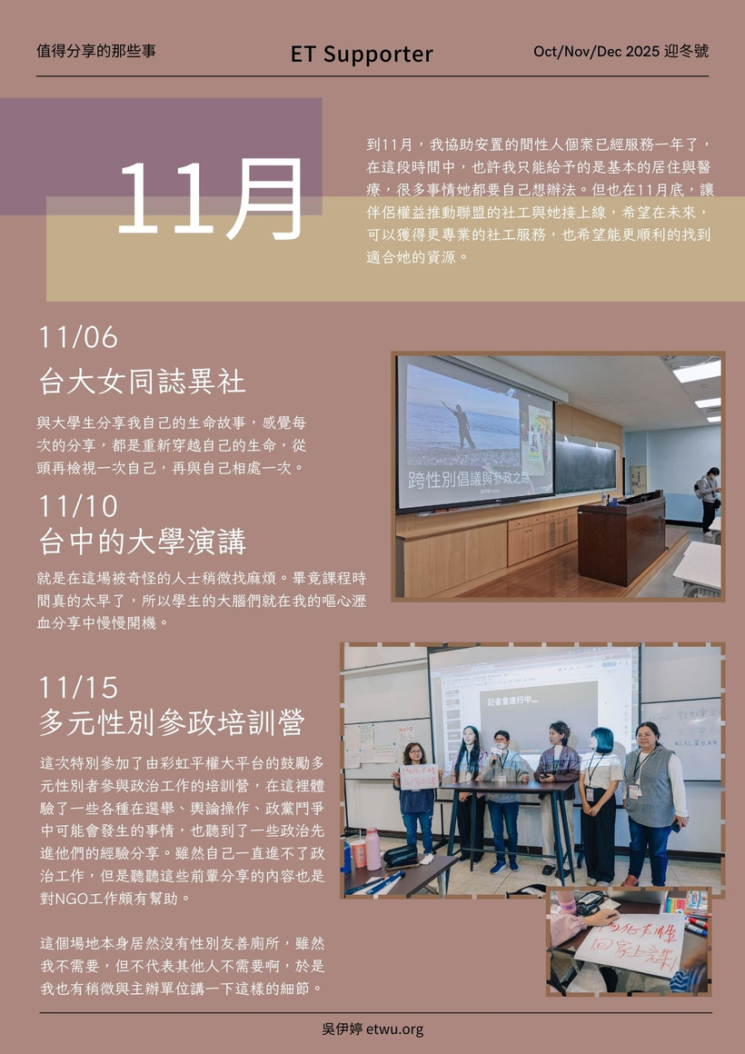 到11月,我協助安置的間性人個案已經服務一年了,在這段時間中,也許我只能給予的是基本的居住與醫療,很多事情她都要自己想辦法。但也在11月底,讓伴侶權益推動聯盟的社工與她接上線,希望在未來,可以獲得更專業的社工服務,也希望能更順利的找到適合她的資源。