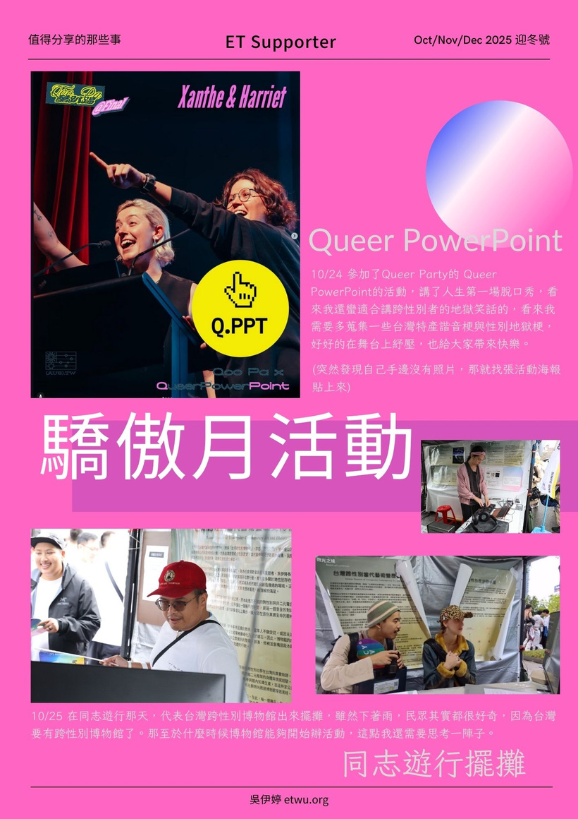 10/24 參加了Queer Party的 Queer PowerPoint的活動,講了人生第一場脫口秀,看來我還蠻適合講跨性別者的地獄笑話的,看來我需要多蒐集一些台灣特產諧音梗與性別地獄梗,好好的在舞台上紓壓。