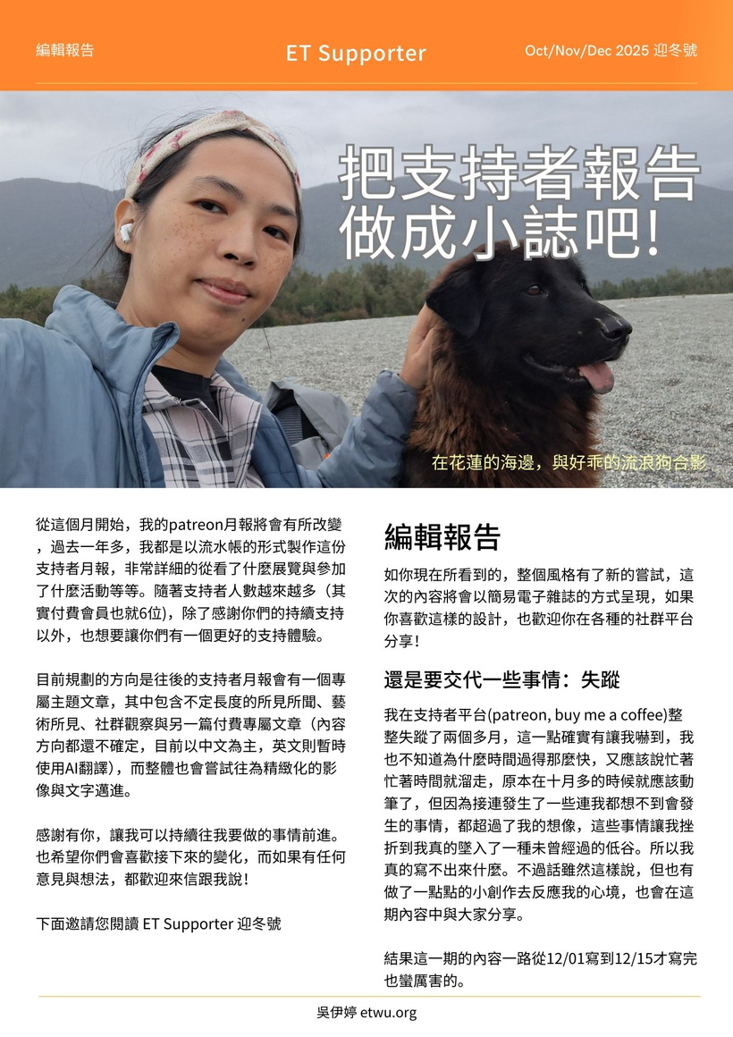 目前規劃的方向是往後的支持者月報會有一個專屬主題文章,其中包含不定長度的所見所聞、藝術所見、社群觀察與另一篇付費專屬文章(內容方向都還不確定,目前以中文為主,英文則暫時使用AI翻譯),而整體也會嘗試往為精緻化的影像與文字邁進。