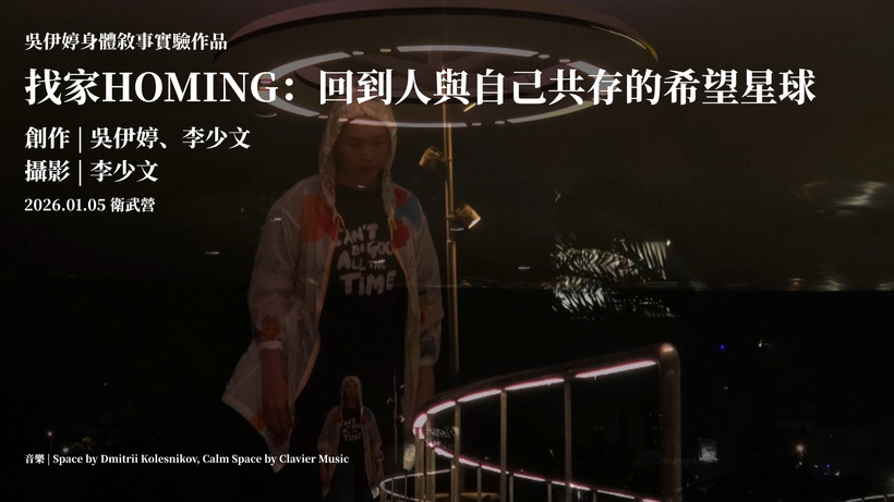 1月初時,因為去衛武營逛逛,在走廊看到了很有特色的幽浮燈,心中聯想到人類與宇宙的關係,又再連結到了我們與自身的關係,那時趁著剛好與朋友身上有攝影設備,我們兩個人在那個長長的走廊完成了一個有點即興的身體敘事實驗作品《找家HOMING:回到人與自己共存的希望星球》